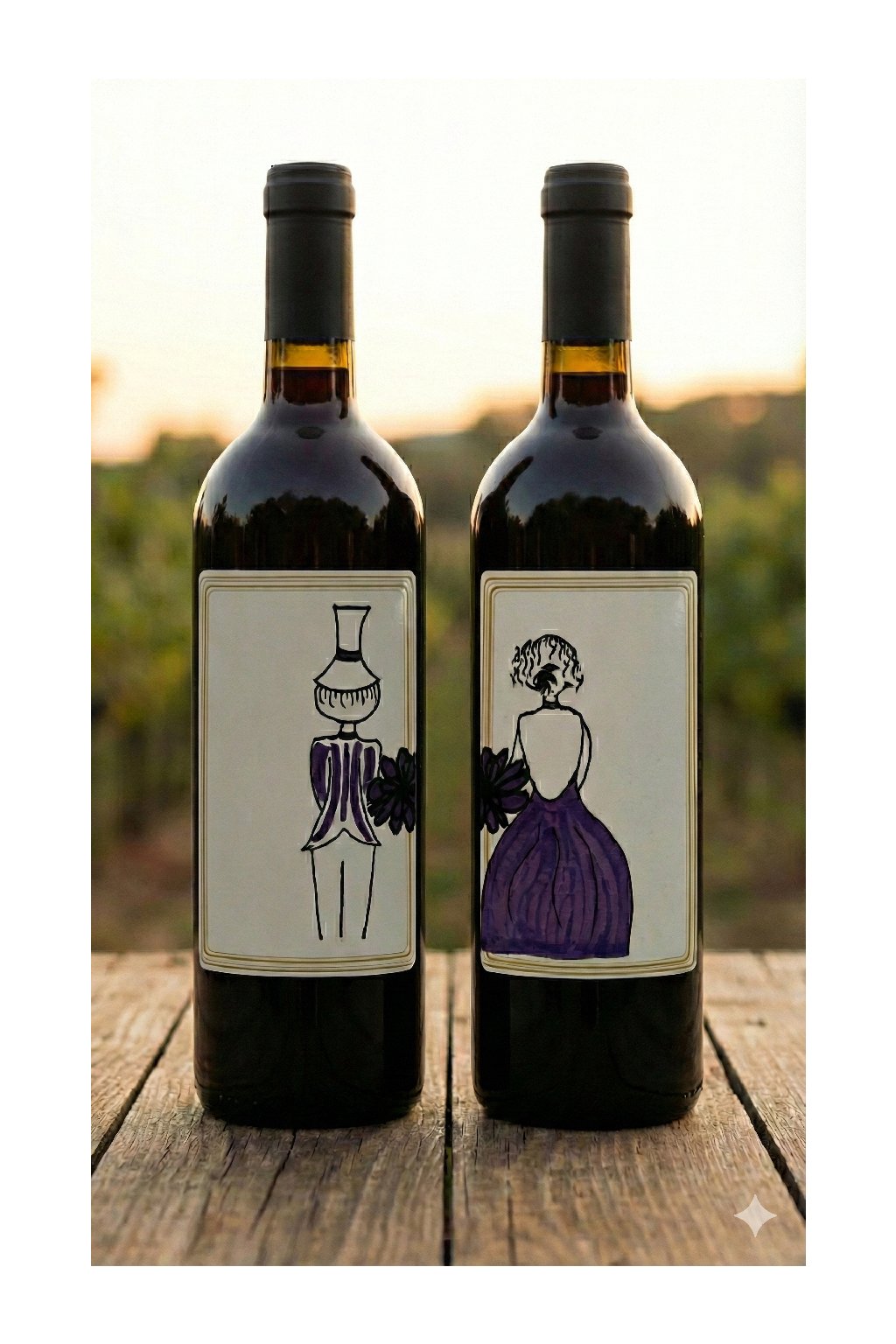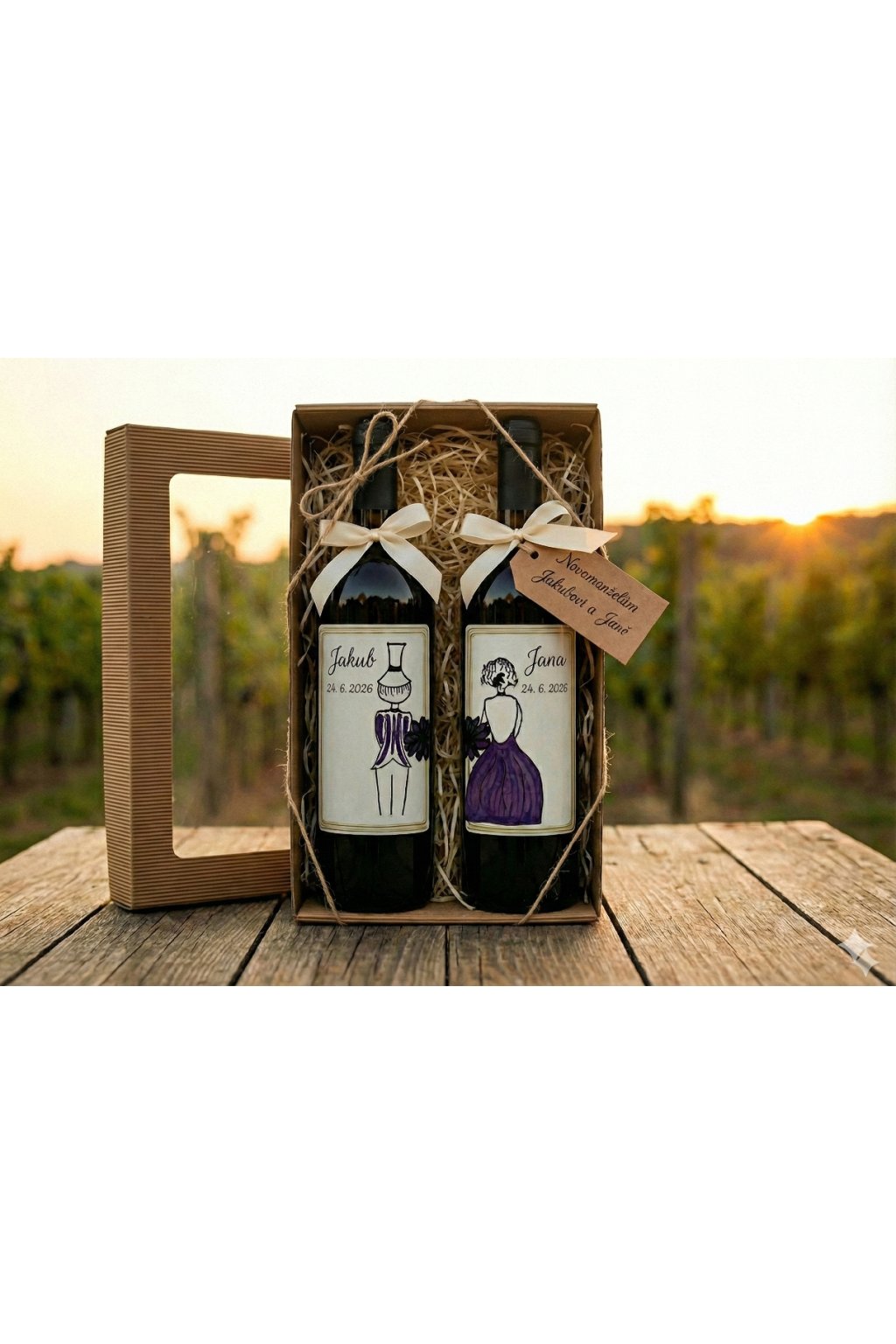Připravíme pro vás luxusní dárkovou sadu dvou vín s etiketami vytvořenými přímo na míru. Na lahve doplníme jména ženicha a nevěsty i datum jejich velkého dne, čímž vznikne krásný památeční předmět, který si mohou schovat k výročí.